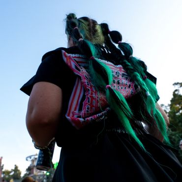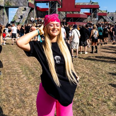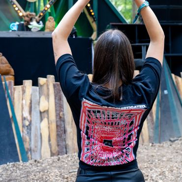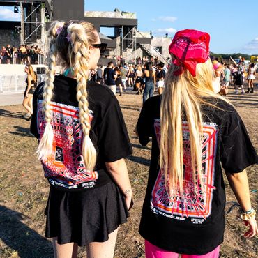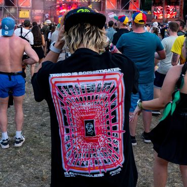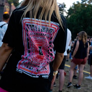 Der Backprint war eine richtig coole Herausforderung! Es gab so viele tolle Ideen, wie das Libellenmotiv und der Sophisticated-Stil zeichnerisch umgesetzt und mit Techno verbunden werden könnte! Aber keine Lösung hat uns wirklich überzeugt. Bei einem Treffen im Studio von Electronicliebe fiel ein Foto an der Wand auf, die unser Team sofort in ihren Bann zog: eine Aufnahme von der Electronicliebe-Bühne auf dem OpenBeatz Festival 2018, das tanzende Menschen, einen DJ in der Mitte und das in der Luft schwebende Electronicliebe-Logo zeigte. Dieses Foto vermittelte genau den gewünschten Vibe von guter Laune und guter Musik perfekt – ein absoluter Volltreffer! Die ersten Skizzen wurden einige Tage später präsentiert und alle waren begeistert – genau dieser Vibe wurde eingefangen!